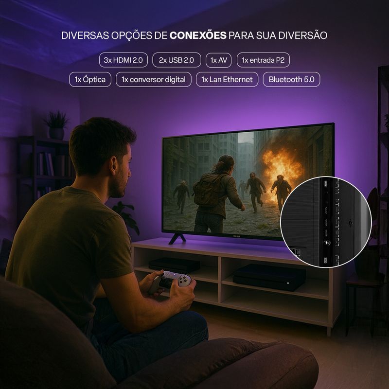 Várias entradasSão eles: wi-fi, 3x HDMI 1.4; 2x USB 2.0; 1x AV; 1x P2; 1x Óptica; 1x conversor digital e 1x Ethernet para você conectar seus dispositivos com facilidade.