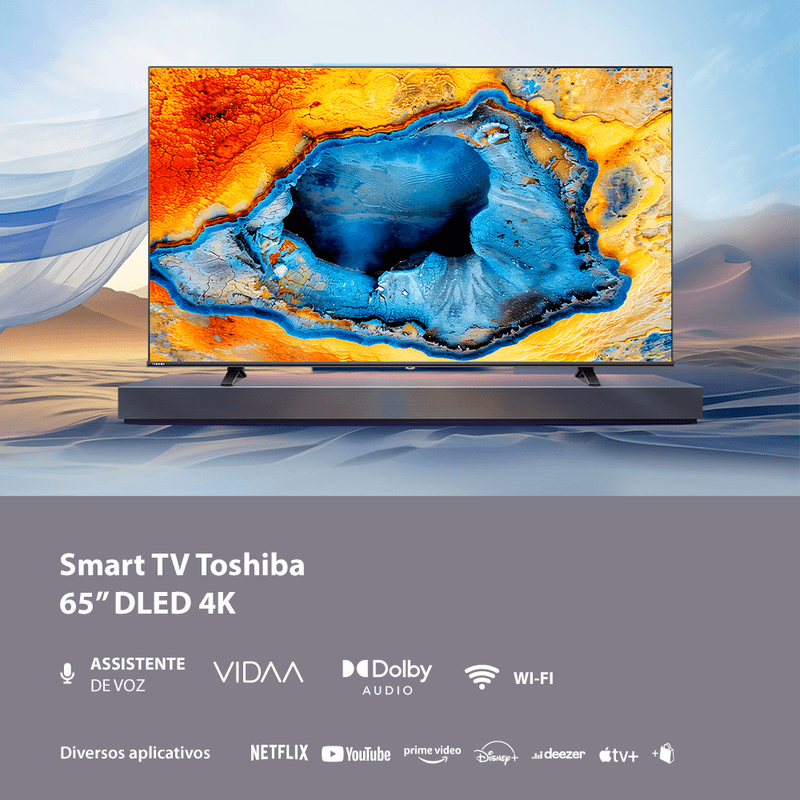 Smart TV DLED 65" 4K Toshiba 4K, seus problemas de entretenimento em casa são coisa do passado. Com imagens tão nítidas que parece que você está olhando através de uma janela, cores tão vibrantes que saltam da tela e um sistema de áudio que o coloca no centro da ação, está