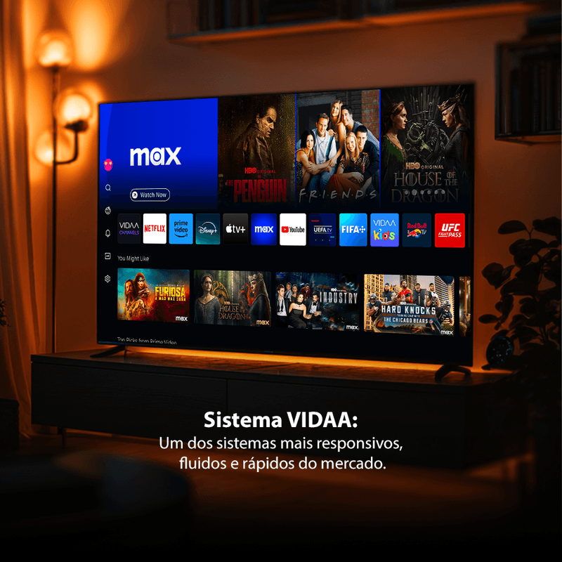 - Navegação Simplificada: O sistema operacional VIDAA oferece uma interface rápida, amigável e altamente customizável para uma experiência de uso sem complicações.